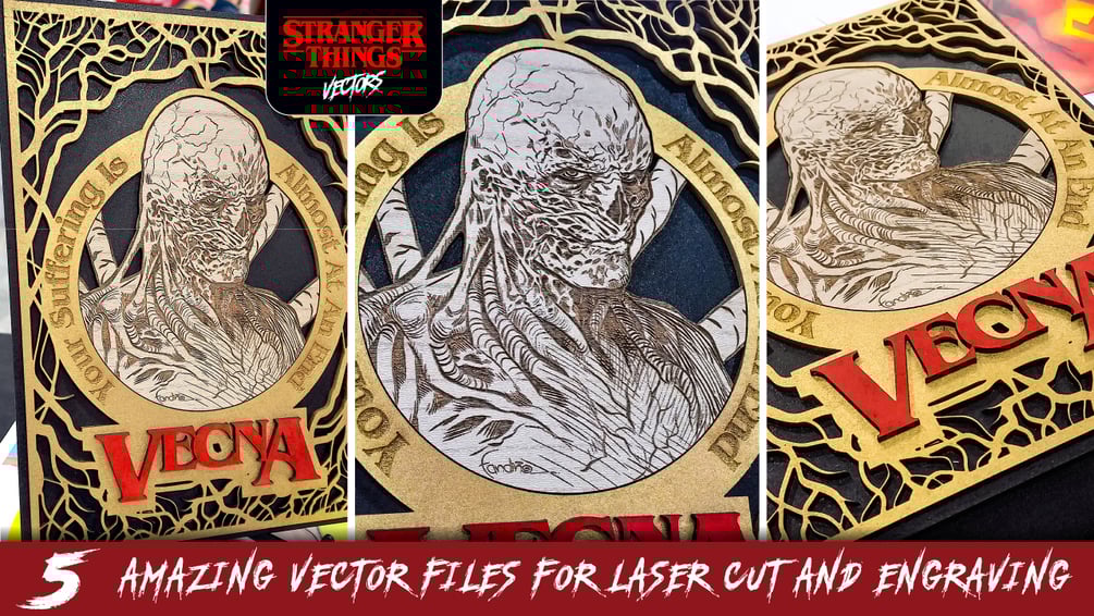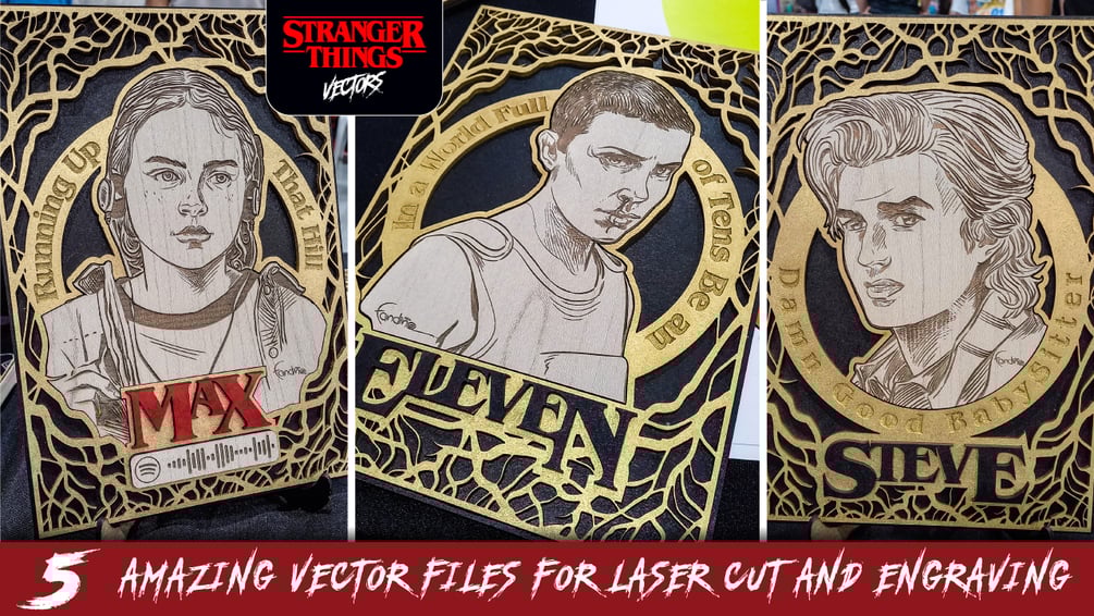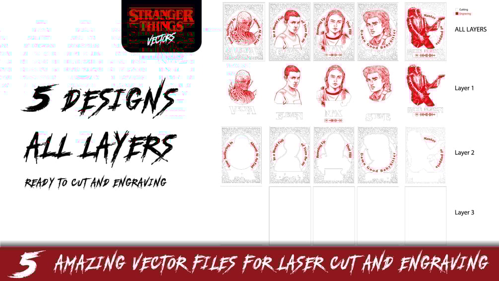 Five amazing designs of vectors ready to cut and engraving (three design layers). Make a nice decorative element of the characters from the Stranger Things series. You can use it on wood of any thickness. Download 5 vectors drawn by laser engraving artist Gabriel Fandiño. EPS format